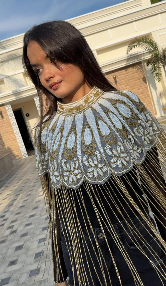 Beautiful Handwork Cutpipes Work Fringes Cape White & Gold 190824B