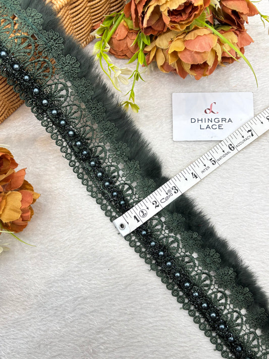 Beautiful Cotton Based Pearls And Feather Work 3 Inches Broad Lace Green 220925