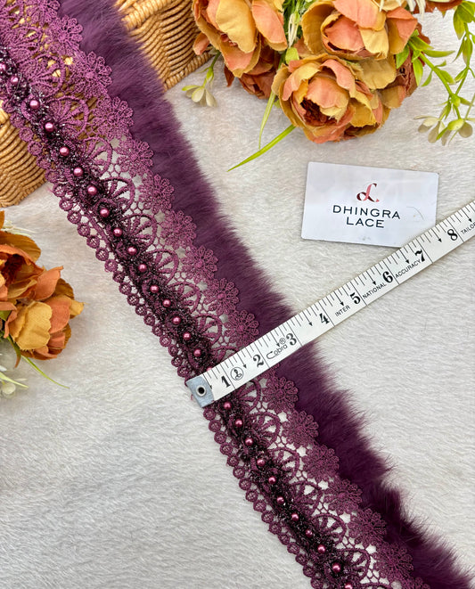 Beautiful Cotton Based Pearls And Feather Work 3 Inches Broad Lace Wine 220925