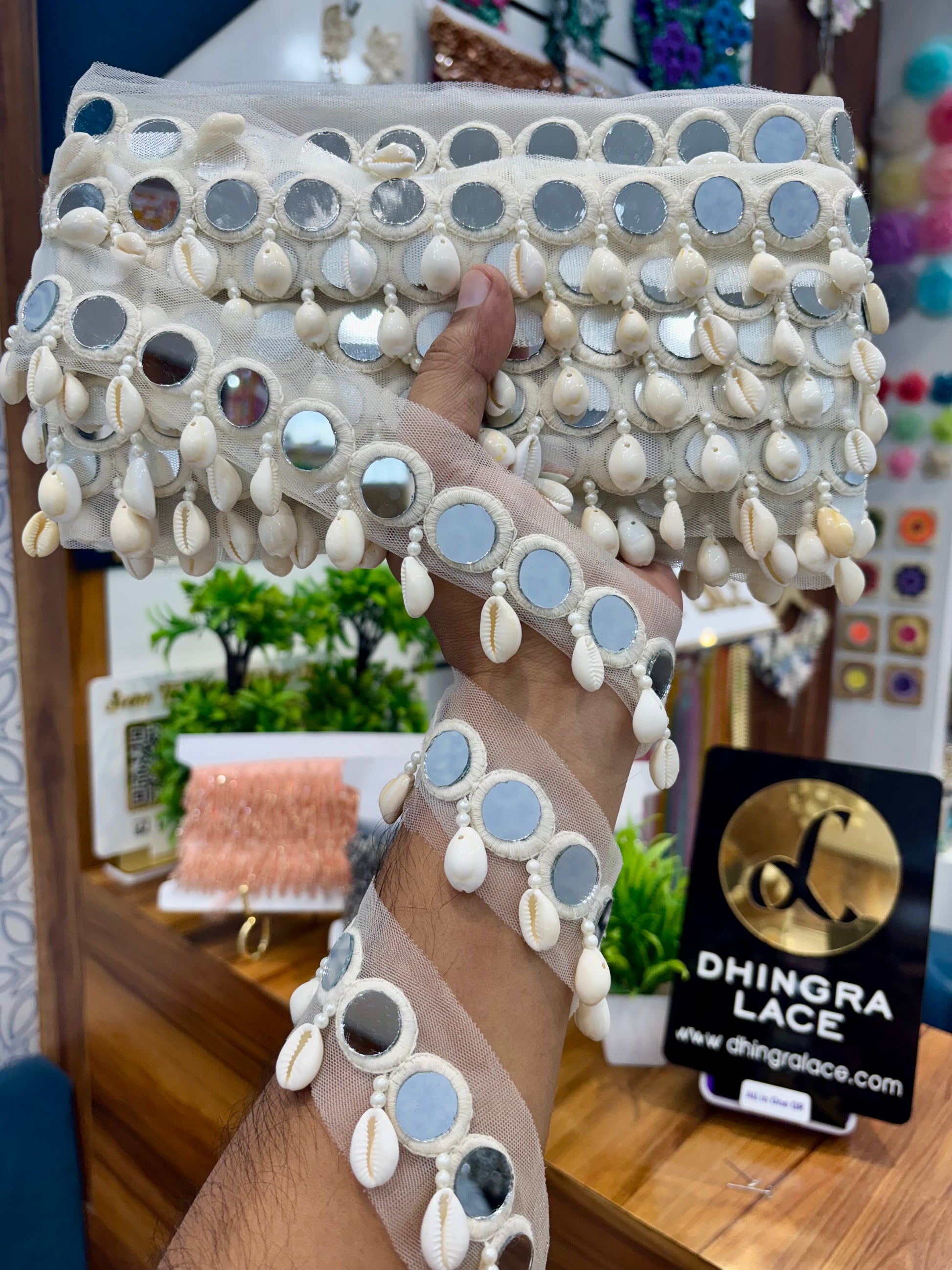 This lace features intricate mirror work and delicate hanging details. It is carefully crafted to add a touch of beauty and elegance to any garment or home decor project. Perfect for adding a unique and stylish touch to your creations.