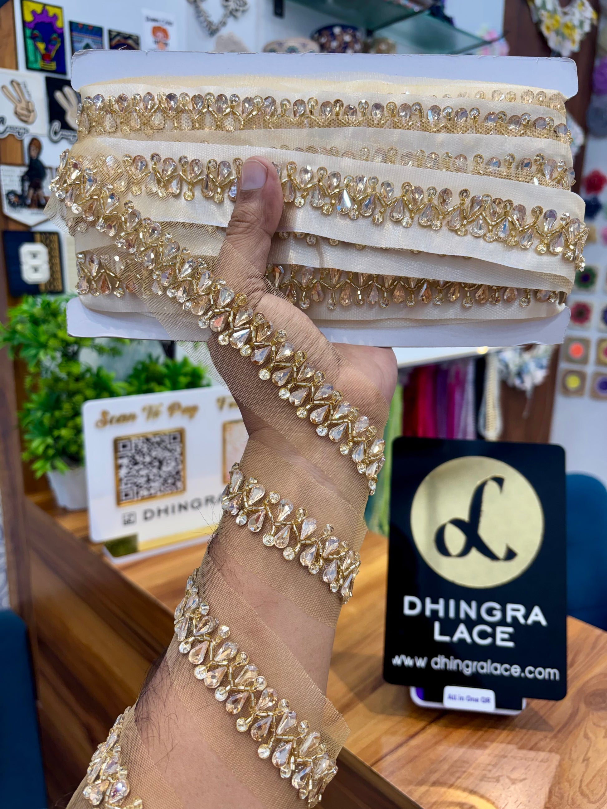 This lace features intricate net-based crystal work that adds a touch of elegance and beauty to any garment. Made with high-quality materials, this lace is perfect for adding a touch of glamour to dresses, blouses, and more. Experience the luxurious look and feel of this crystal work lace.