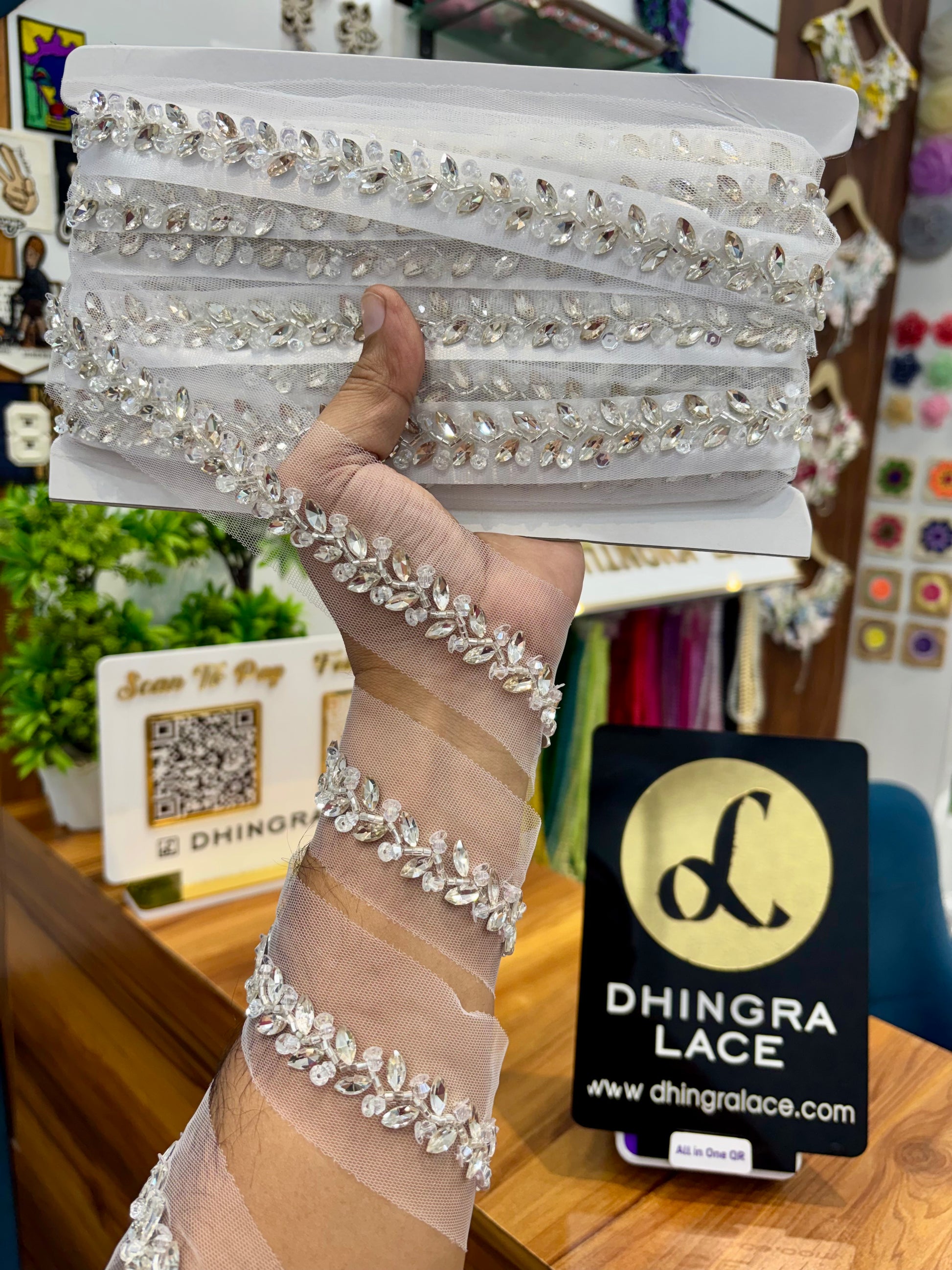 This beautiful lace features intricate crystal work and is made using advanced net-based techniques. It creates a stunning, delicate look that will enhance any garment or accessory. Expertly crafted, it adds a touch of elegance and sophistication to your style.