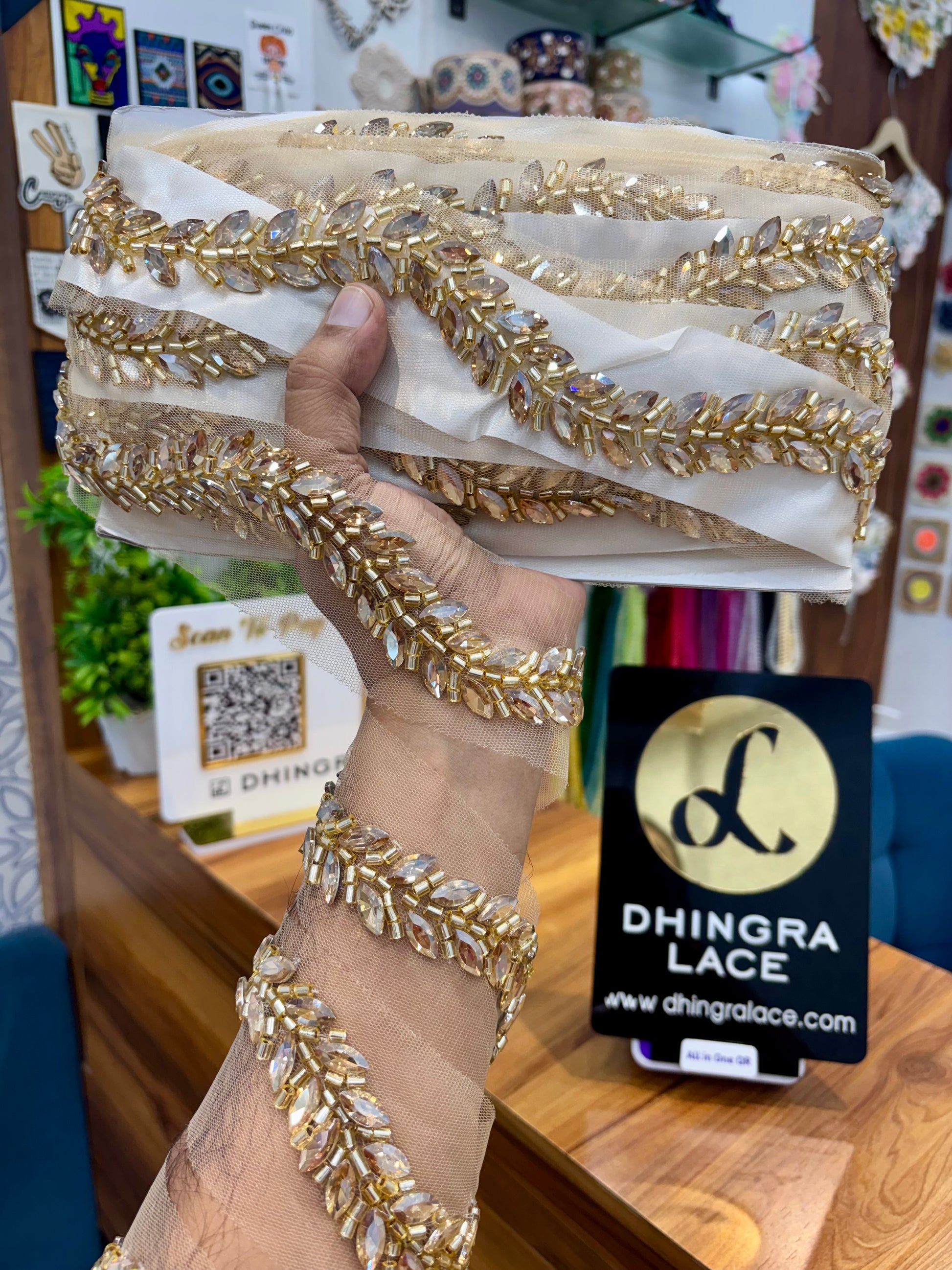Update: The Beautiful Net Based Crystal Work Lace 141025 features intricate crystal work that adds a touch of elegance and glamour to any garment. With its net base and delicate lace design, this product is perfect for those looking to add a sophisticated touch to their fabric or accessory.
