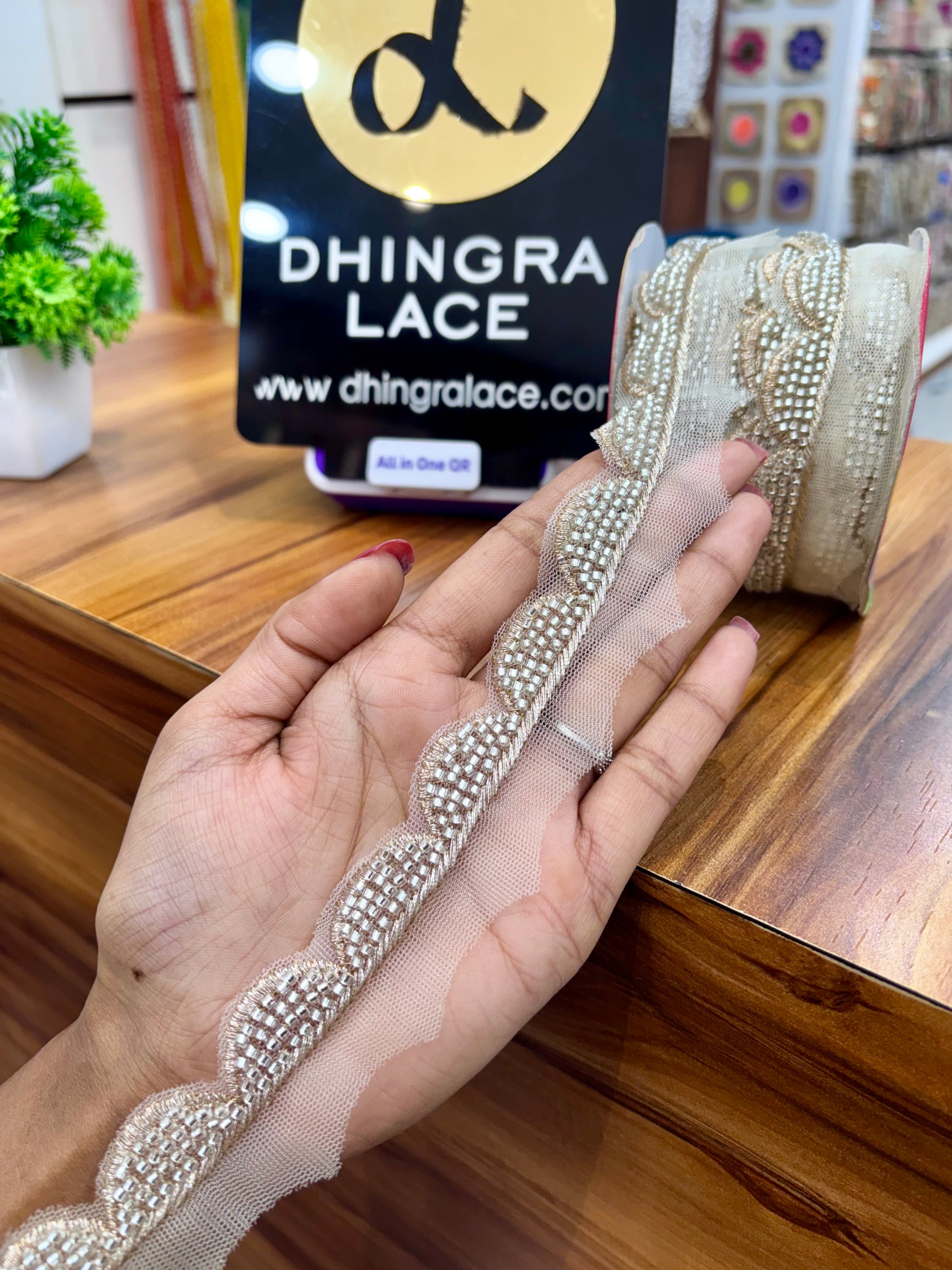 This Beautiful Net Based Cutdana Work Lace 201125 features intricate design and high-quality craftsmanship, perfect for adding an elegant touch to any garment. Made with precision and using the finest materials, this lace is both durable and visually stunning. Enhance your clothing with this beautiful addition to your wardrobe.