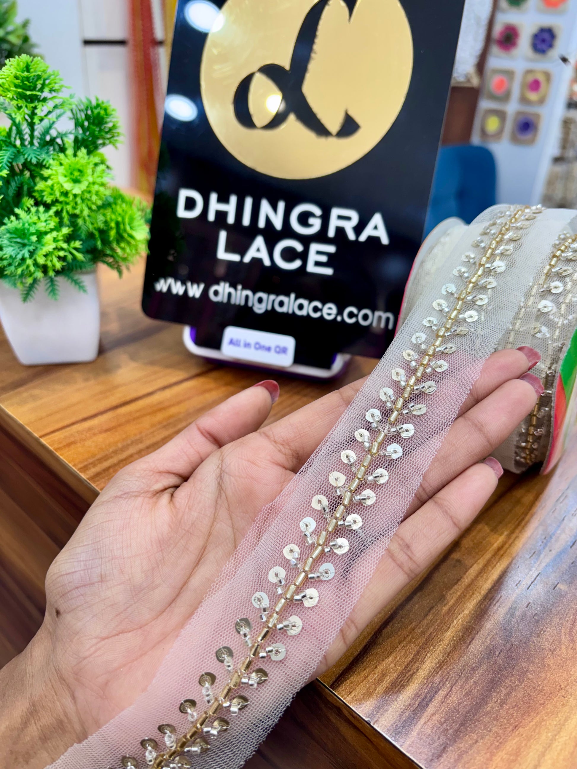 Expertly crafted net lace with intricate cutdana work. Enhance any garment with a touch of elegance and sophistication. Provides a unique embellishment to any outfit. Perfect for formal occasions and adding a touch of glamour. Made to last, ensuring durability and stunning results.