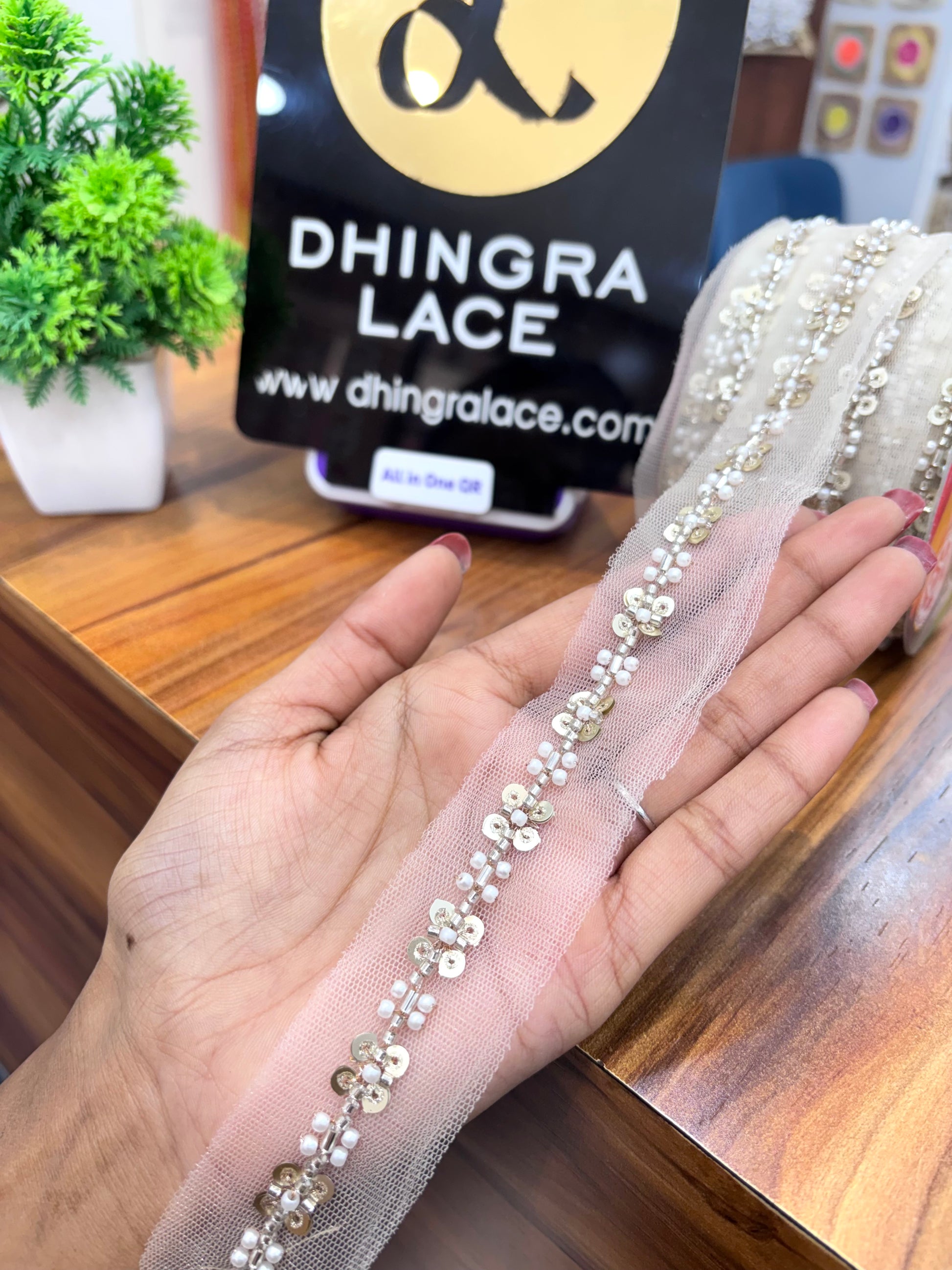 This beautiful lace features a delicate cutdana work design, perfect for adding a touch of elegance to your clothing or accessories. Crafted with the highest quality materials, it adds a sophisticated and timeless element to any garment. Enhance your style and make a statement with this stunning net based lace.