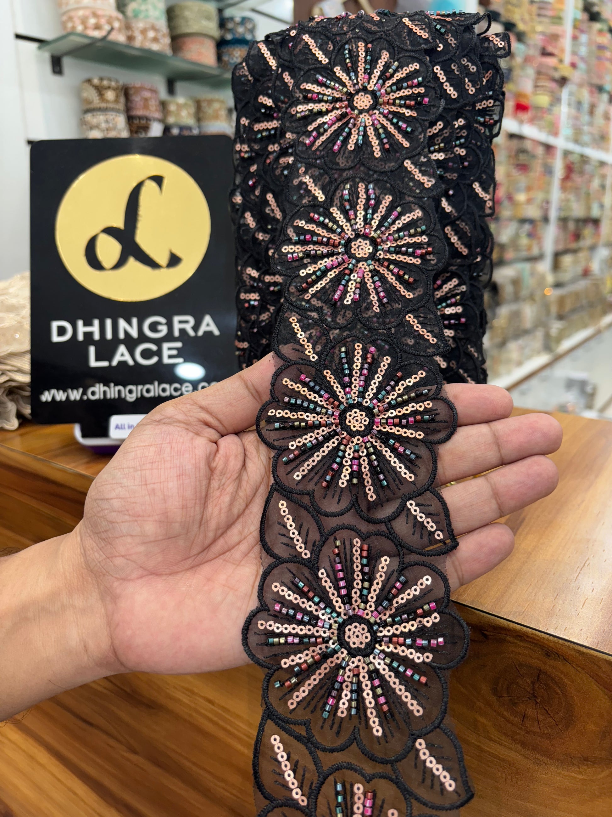 Enhance any outfit with our Beautiful Net Based Flower Lace Black Multi 100925. Made with delicate lace, this black multi design adds a touch of sophistication to your wardrobe. Perfect for any occasion, this lace pattern is sure to elevate your style. Available now.