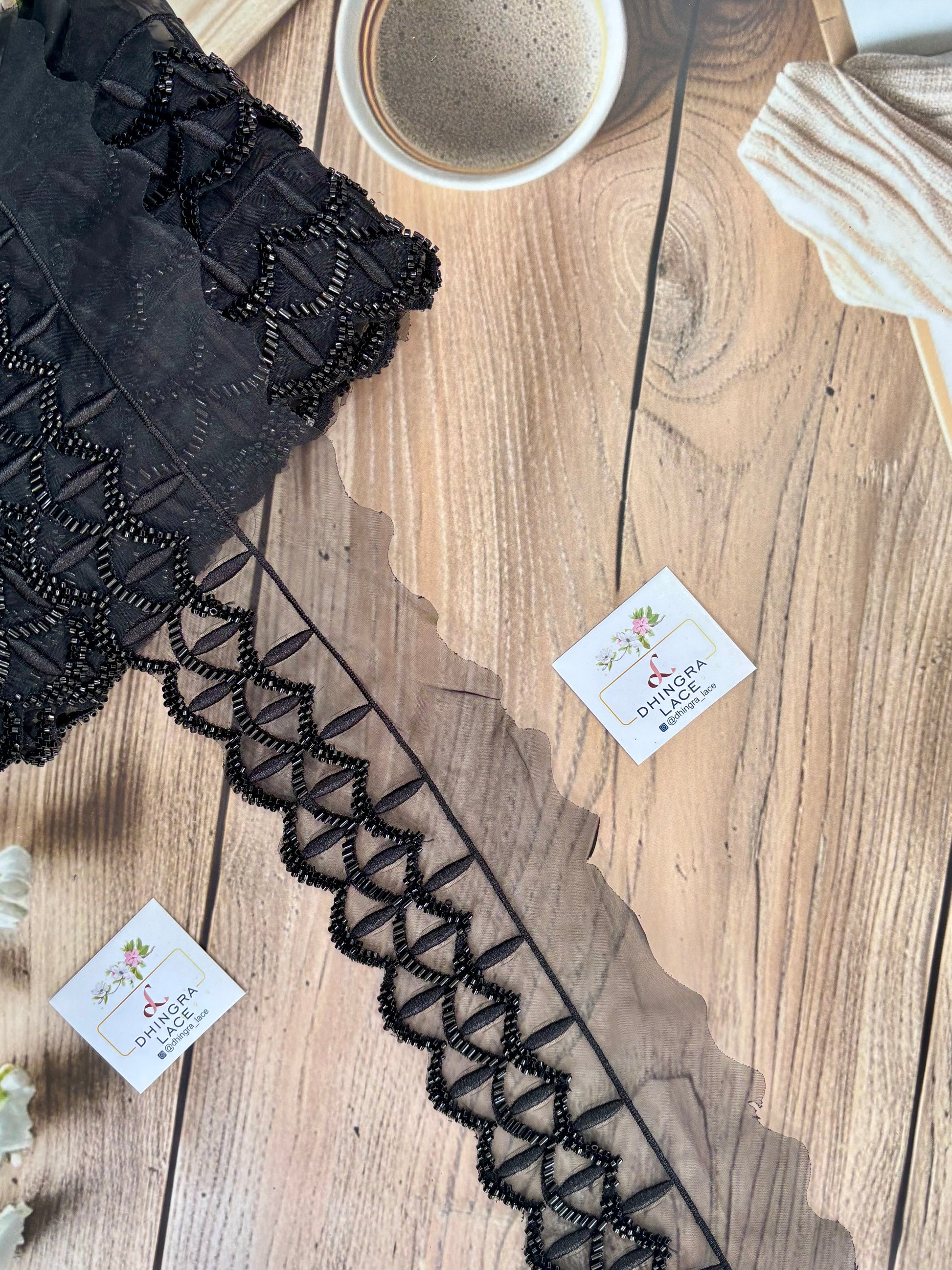 This black lace features delicate organza threadwork, adding elegant detail to any garment or accessory. Made from high-quality materials, this lace is perfect for adding a touch of sophistication to your designs. Elevate your fashion game with our beautiful organza-based lace.