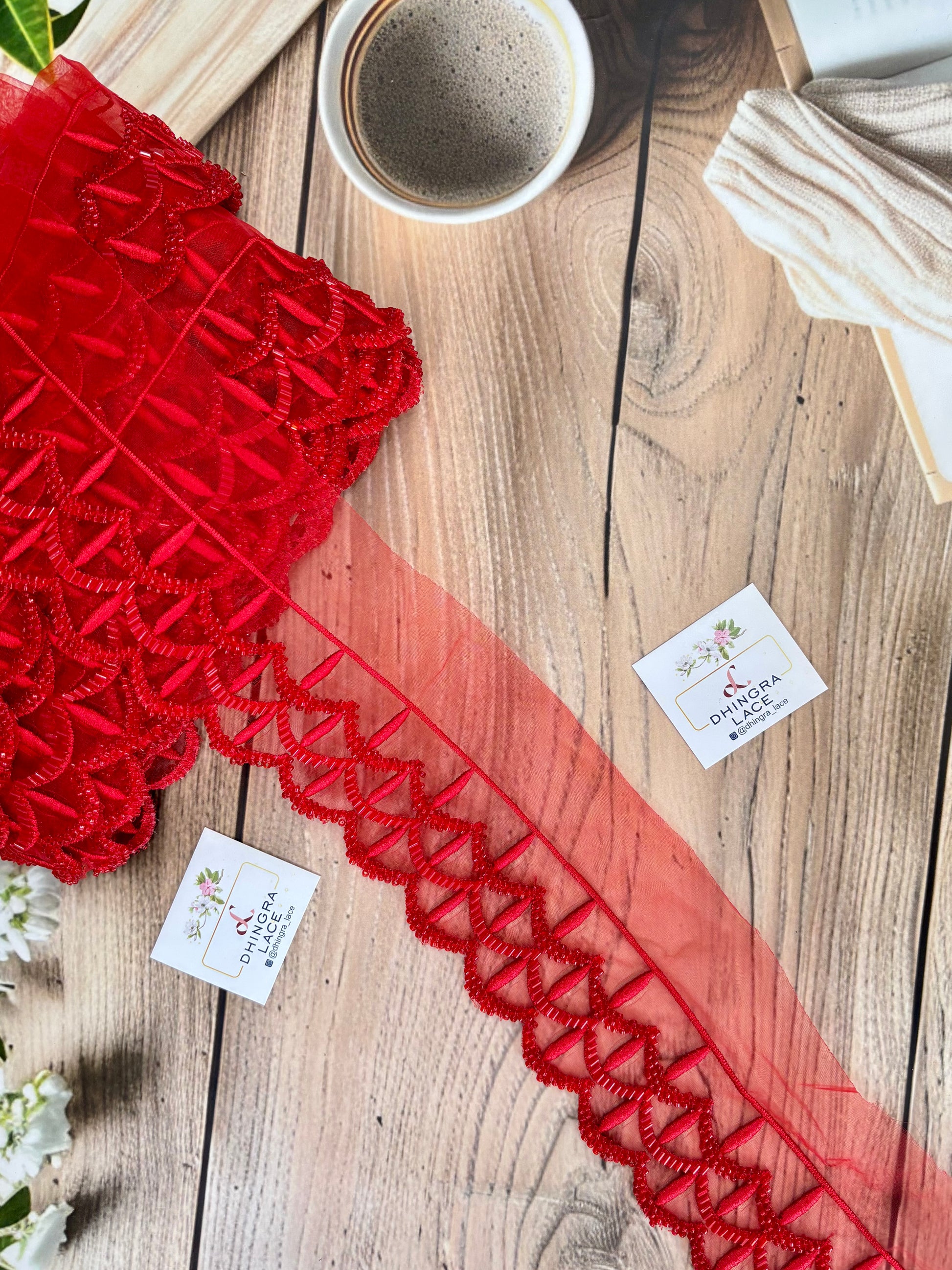 Expertly crafted, this Beautiful Organza Based Threadwork Or Cutpipe Work Lace Red 200925 is perfect for adding a touch of elegance to any garment. Made with intricate details and high-quality materials, it offers a delicate and luxurious look. Enhance your style and make a statement with this beautiful lace.