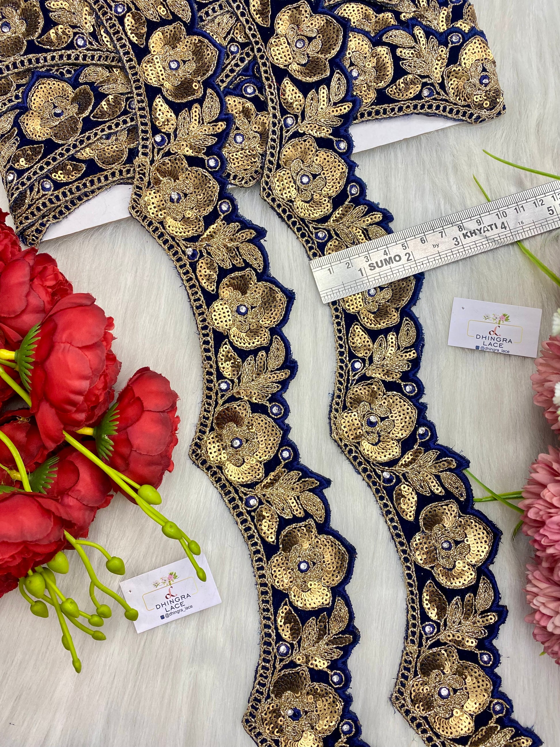 Introducing the Beautiful Velvet Based 2 Inches Broad Scallop Lace 070126. This lace features a luxurious velvet base and a 2 inch broad scallop design, perfect for adding an elegant touch to any garment. Made with high quality materials, it provides a soft and comfortable feel, making it perfect for all-day wear. Elevate your style with this beautiful lace.