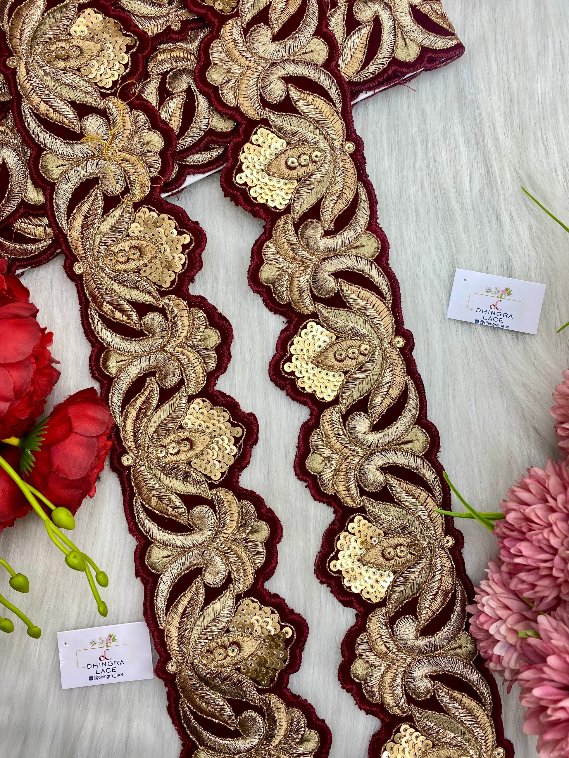 Beautiful Velvet Based 3 Inches Broad Cutwork Lace Maroon 9 Meters 070126/090126
