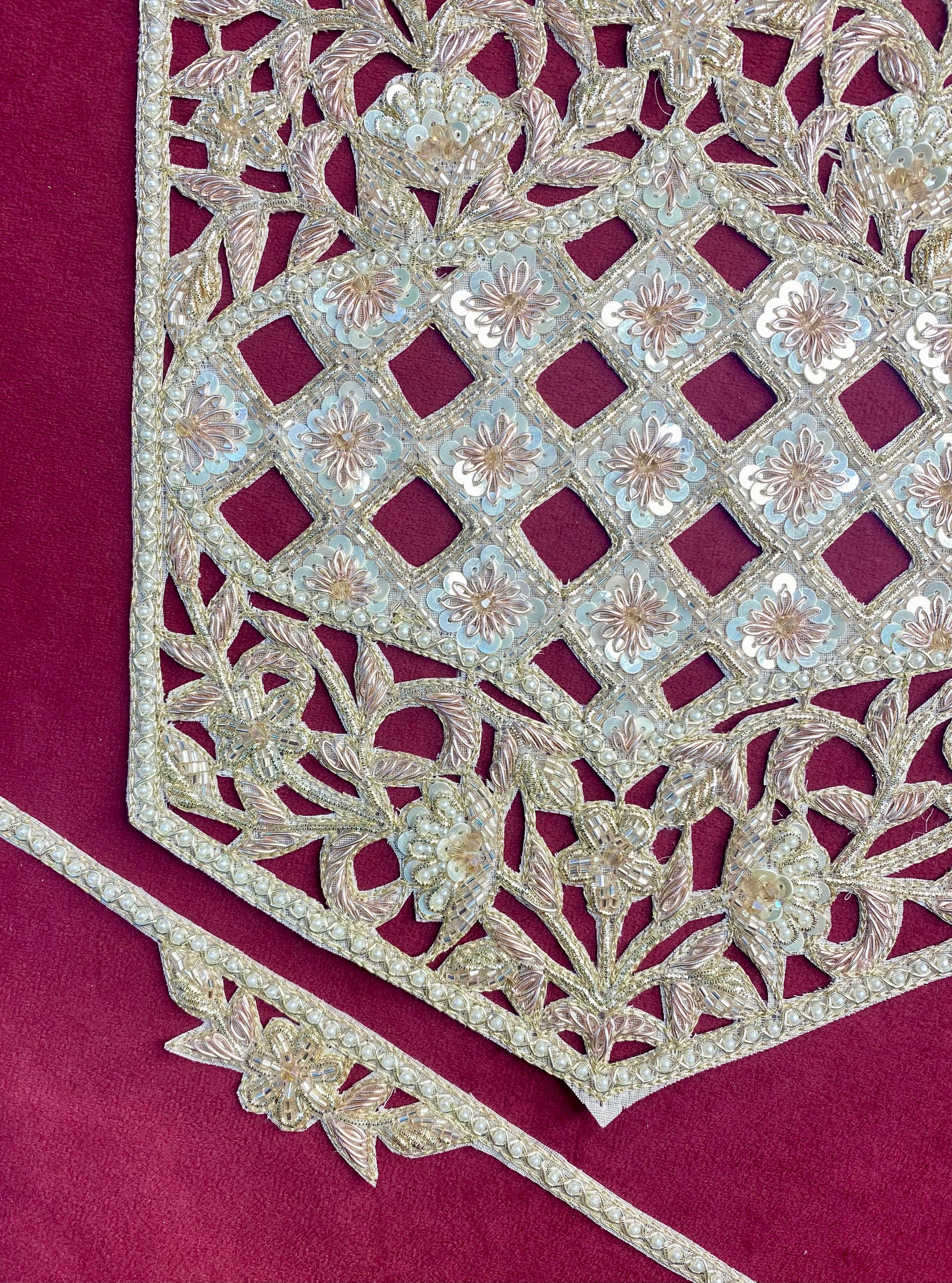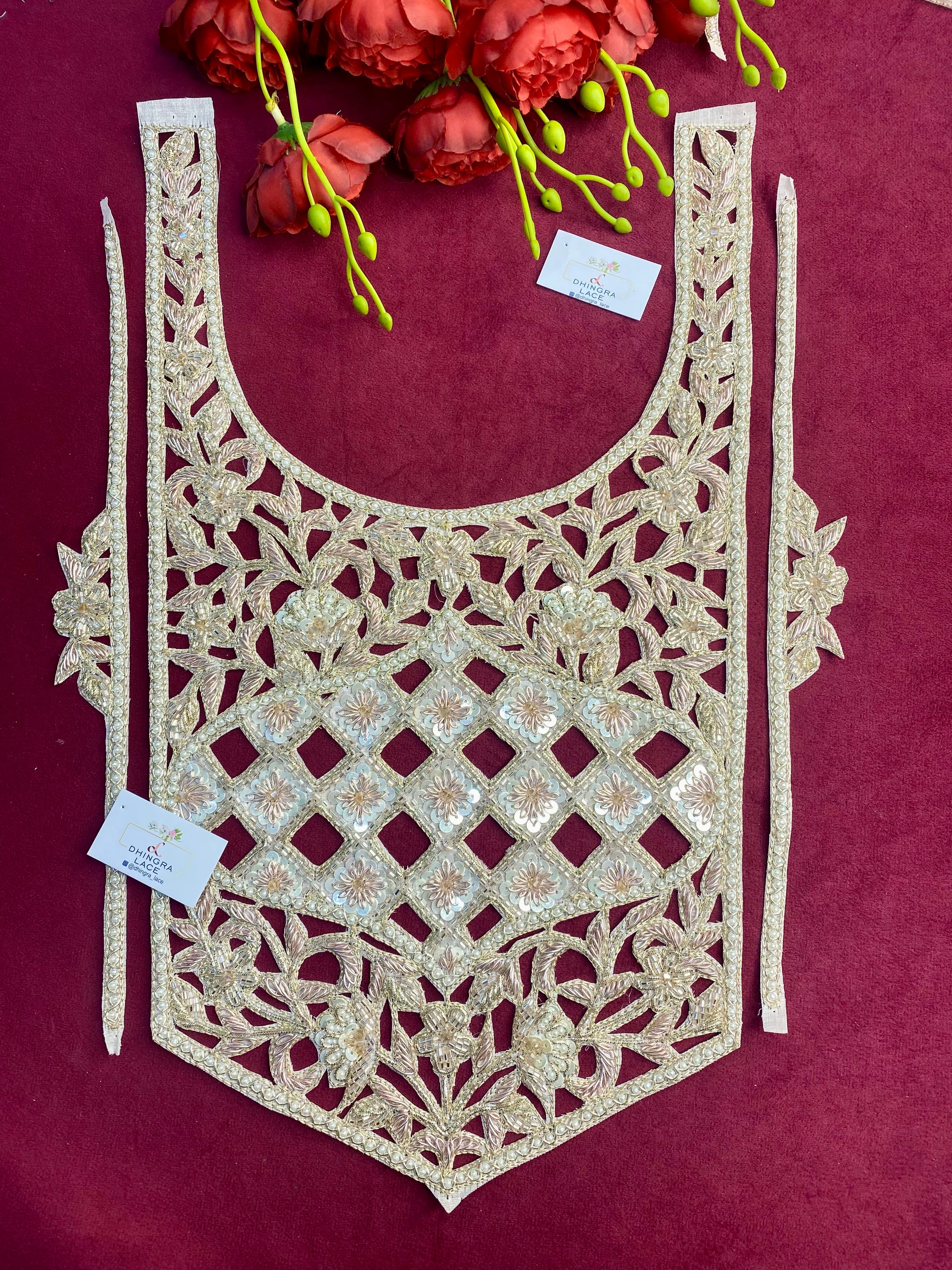 Experience the exquisite craftsmanship of our Beautiful Zardozi work Neck Patches With Sleeves Water Gold 311225. Adorned with intricate details and rich gold accents, these patches will elevate any outfit. Made with high-quality materials, these patches are durable and will add a touch of elegance to your wardrobe.